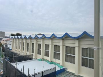 夏休みから工事を始めた体育館ですが、間もなく全工程を終了する予定です。外装の塗装も終わり、現在足場を外しているところです。外装には校舎に合わせて「青」の差し色を入れて一体感をもたせました。内外装とも一新した状況で音楽会(11月21日-22)を実施できることをうれしく思っています。