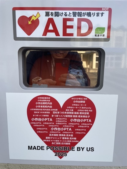 昨年12月23日に小作地区委員の皆様と、賛同者の皆様のおかげをもちまして、保健室前に外用のAED収納ボックスが設置されました。(クラウドファンディング的取組です)これは学校の教育活動みならず、社会教育団体が校庭や体育館を使用している時の不測の事態にも対応できるようにするための取り組みです。今までは校舎内に収納ボックスがあったので、休日等には使用できない状況でした。